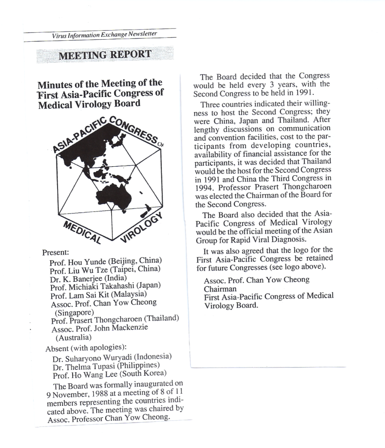A central activity of APSMV was the Asia-Pacific Congress of Medical Virology, which served as the Society’s major scientific meeting. These congresses provided a forum for researchers and clinicians to present new findings, discuss important developments in virology, and strengthen regional scientific links. Over time, APSMV grew into a substantial regional organisation, reaching more than 400 members from 20 countries at its peak. The Society also produced several issues of its newsletter, which helped maintain communication among members and document Society activities.